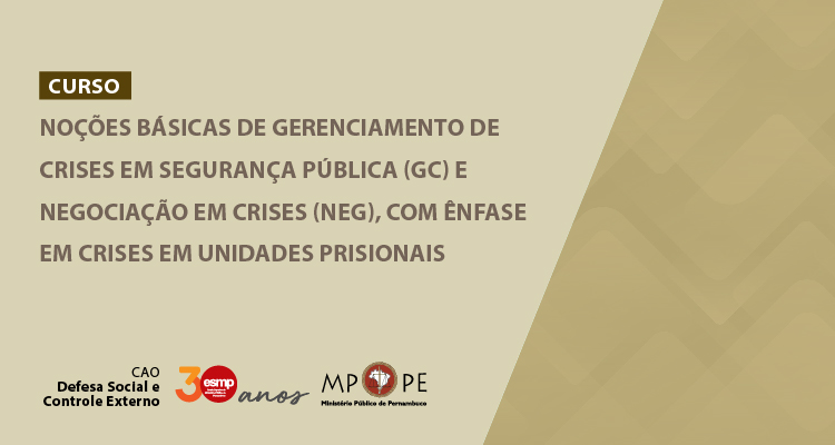 18/03/2026 - O Ministério Público de Pernambuco (MPPE), por meio da Escola Superior (ESMP) e do Centro de Apoio Operacional de Defesa Social e Controle Externo da Atividade Policial (CAO Defesa Social), promoverá entre os dias 7 e 9 de abril o curso “Noções básicas de Gerenciamento de Crises em Segurança Pública (GC) e Negociação em Crises (NEG), com ênfase em crises em Unidades Prisionais”.