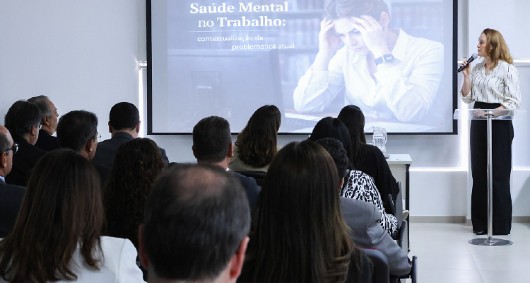 SITUAÇÃO - A palestra principal do evento foi ministrada pela gerente ministerial do Departamento de Apoio à Saúde (DEMAS), médica do Trabalho e médica perita federal, Maíra Ribeiro Gonçalves. Durante a exposição, ela destacou a atual problemática no Brasil e no mundo, apontando a existência de um bilhão de pessoas com algum tipo de doença mental. Também ressaltou fatores que contribuem para o adoecimento mental, como sobrecargas e esgotamento físico, metas excessivas, ansiedade, conflitos interpessoais e falhas na comunicação.